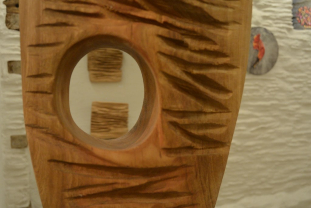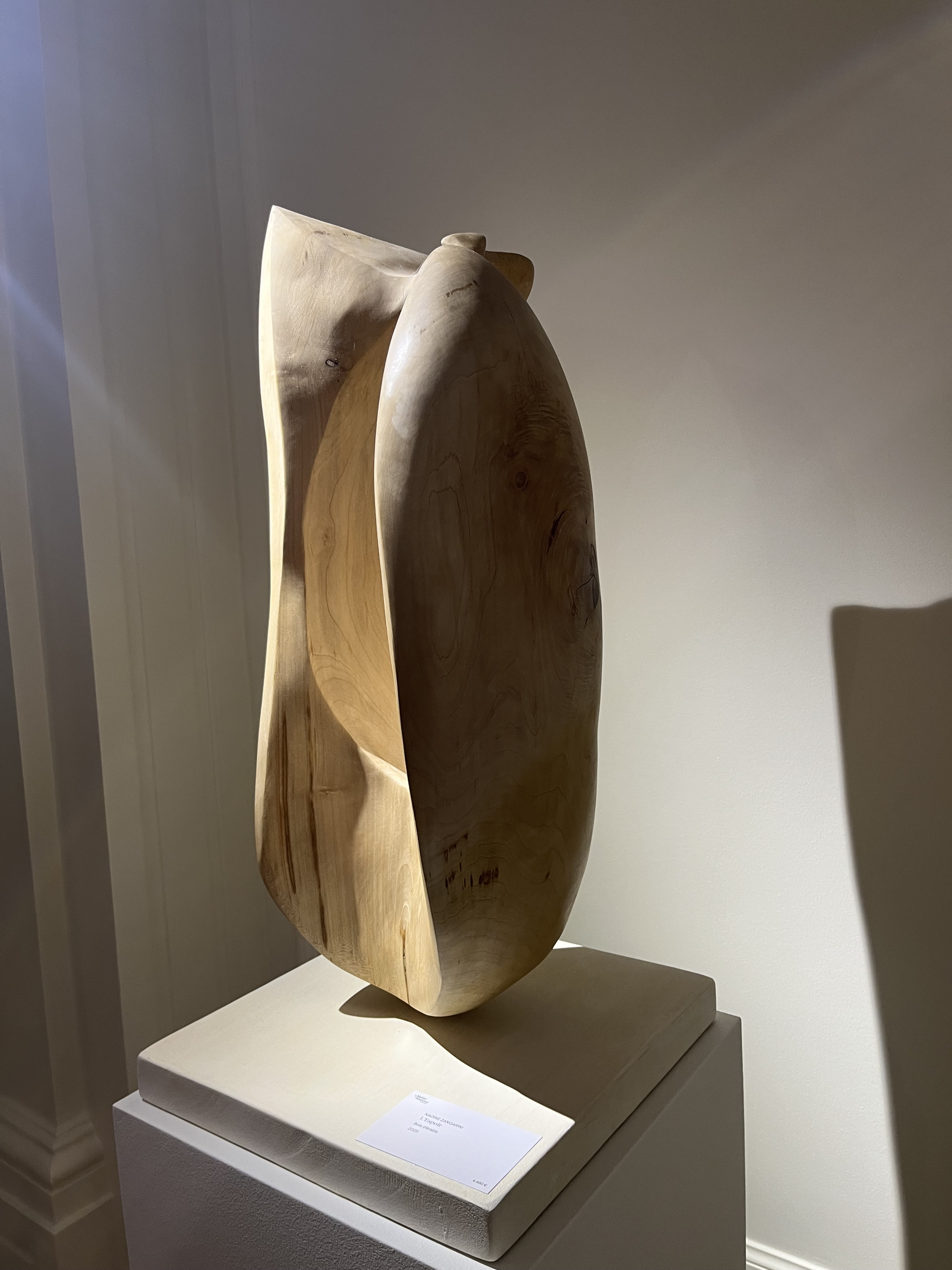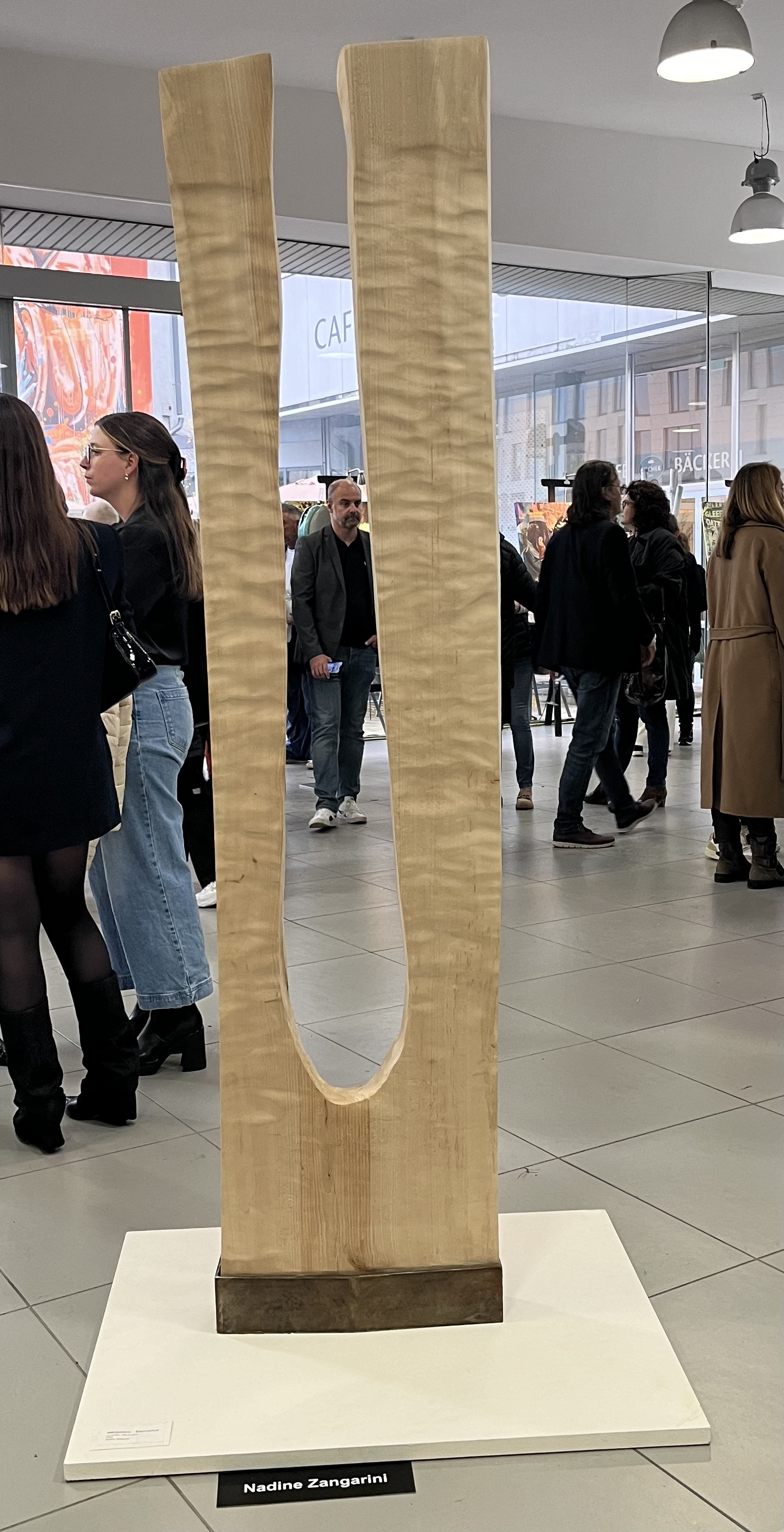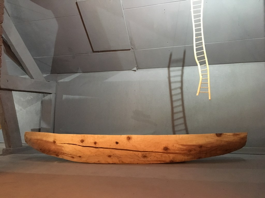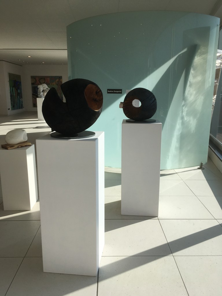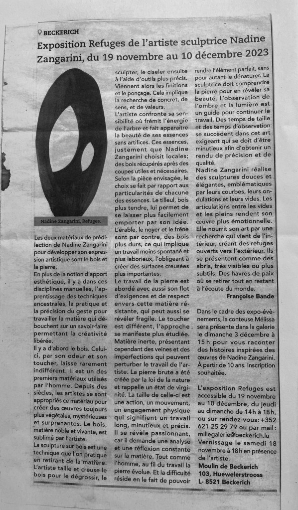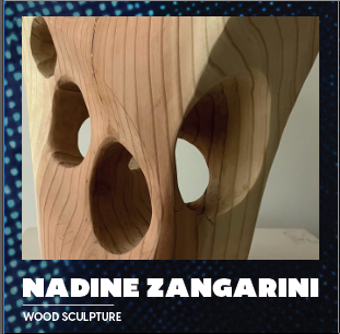 Für die Ausstellung mit dem Namen Voyages hat Nadine Zangarini 15 bis 240 cm lange und 200g bis 80kg schwere Schiffe in mannigfachsten Formen und mit verschiedenen Oberflächen erschaffen. Jedes Ausstellungsstück ist ein Unikat mit einer jeweils anderen Botschaft. Die Schiffe verweisen durch die Reliefs auf unterschiedlich intensive Reisen – von angenehmen friedlichen bis zu schnellen ohne Umwege, bei denen es nur darum geht, ans Ziel zu kommen. Das verwendete Holz stammt ausnahmslos aus ihrer Region und es wurde aus der Notwendigkeit heraus gefällt. Das bearbeitete Holz ist oft noch feucht, wodurch im Laufe der Zeit Risse entstehen – eine ganz besondere Eigenheit dieser Holzarbeiten.