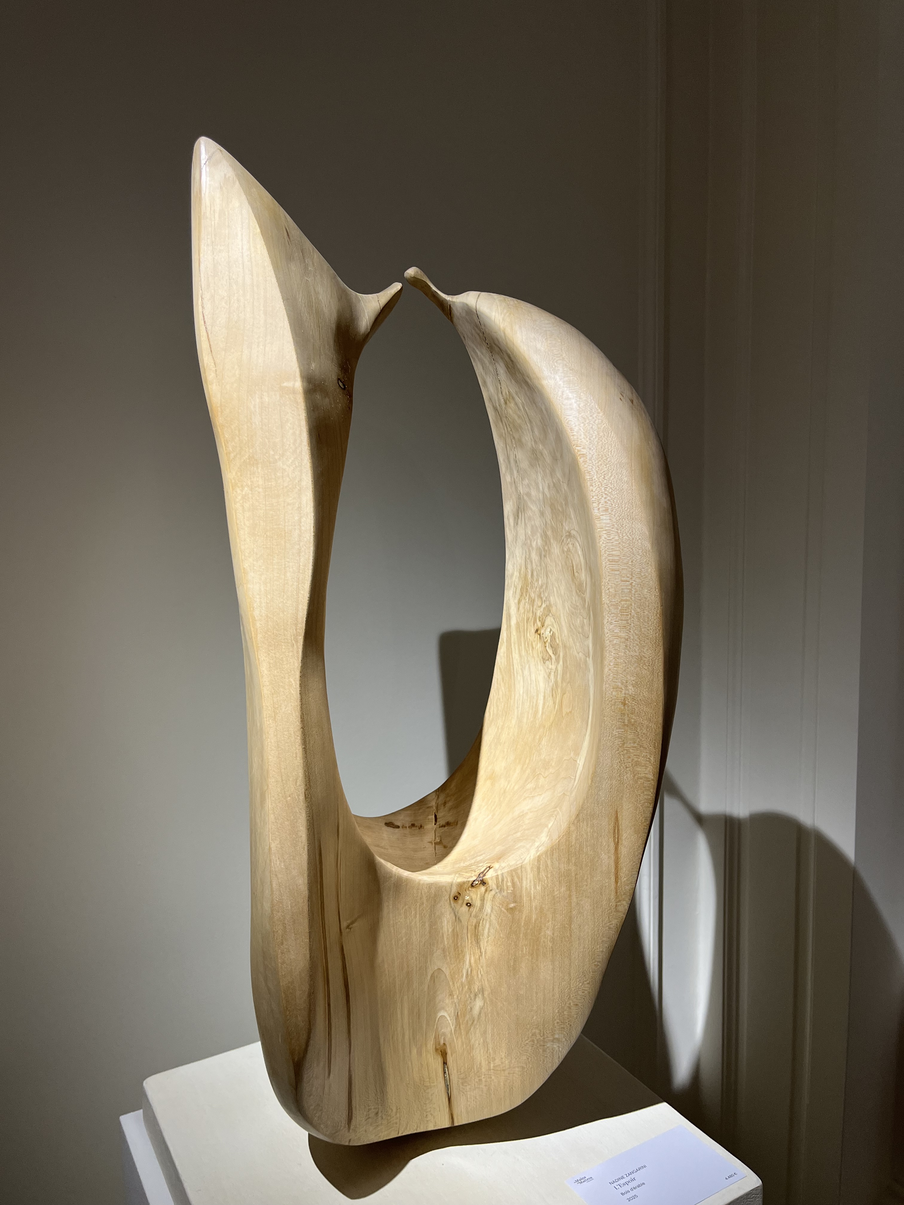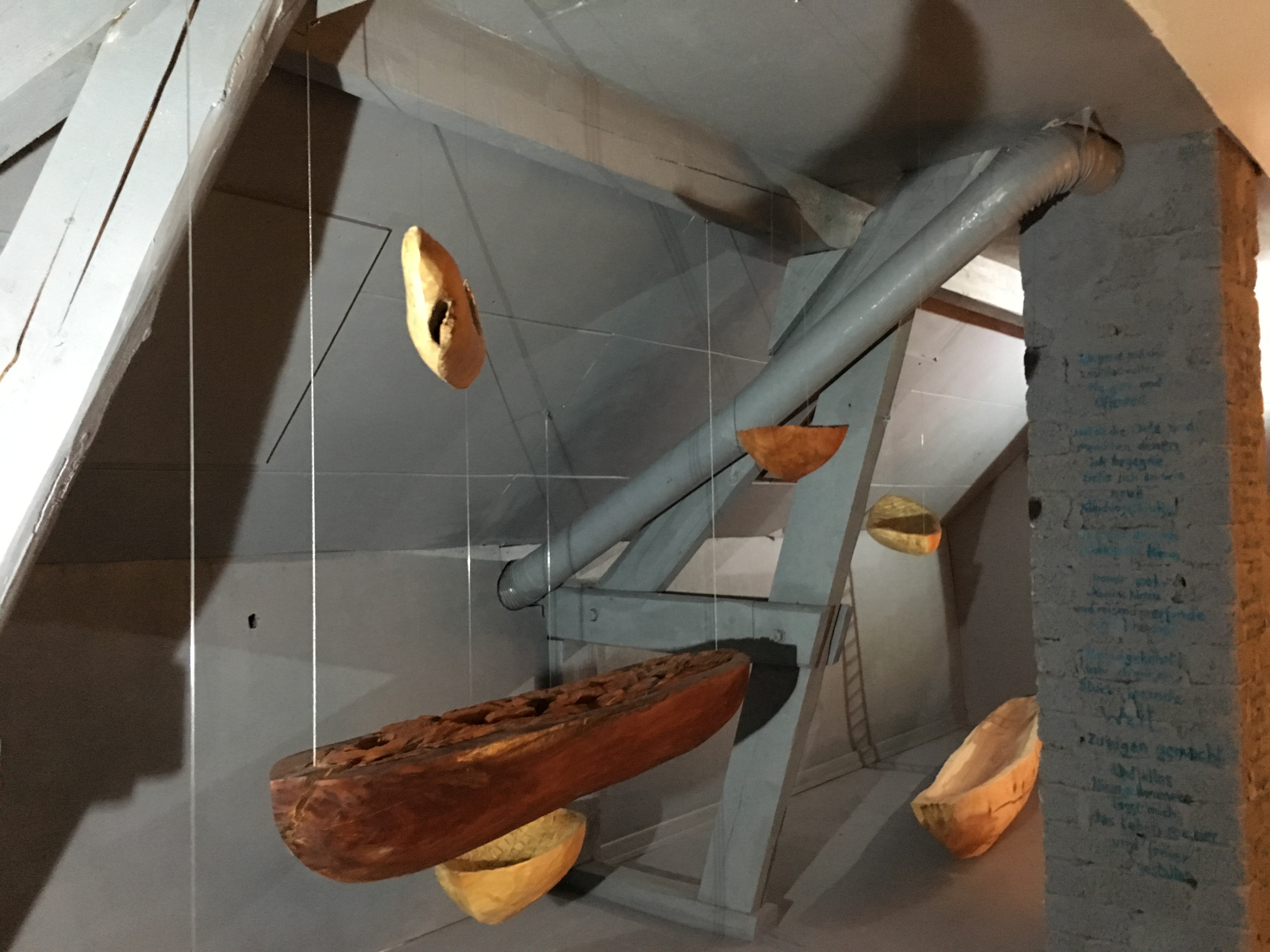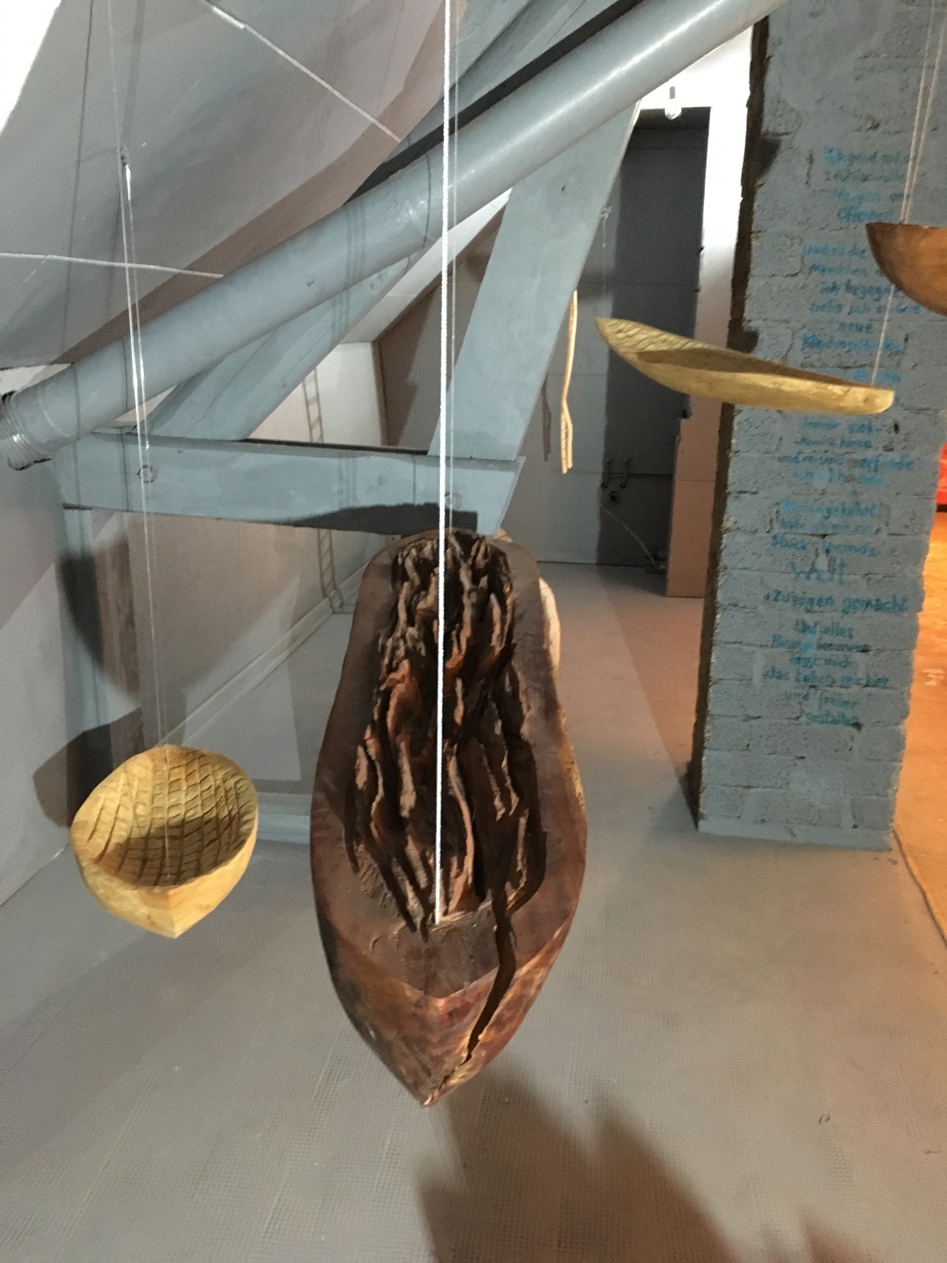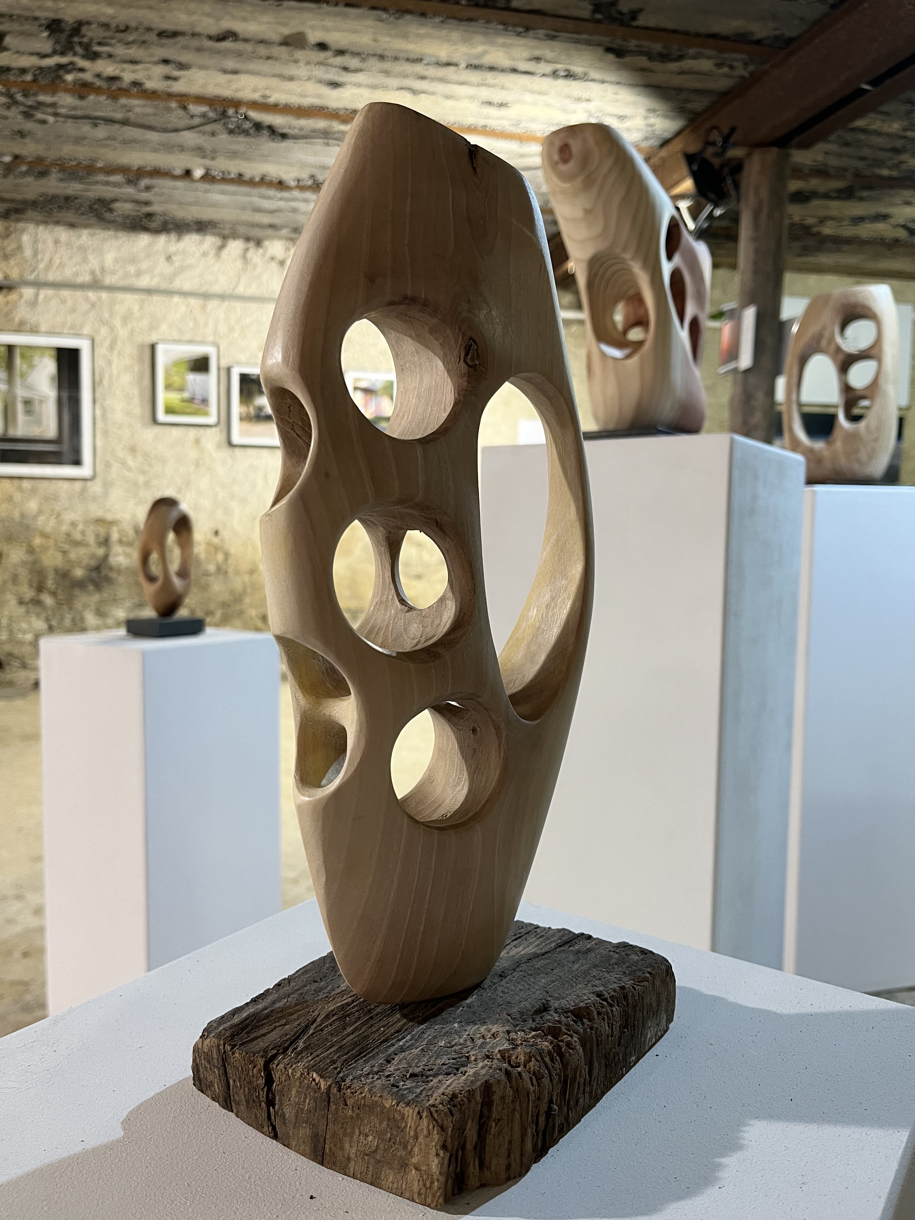 Für die Ausstellung mit dem Namen Voyages hat Nadine Zangarini 15 bis 240 cm lange und 200g bis 80kg schwere Schiffe in mannigfachsten Formen und mit verschiedenen Oberflächen erschaffen. Jedes Ausstellungsstück ist ein Unikat mit einer jeweils anderen Botschaft. Die Schiffe verweisen durch die Reliefs auf unterschiedlich intensive Reisen – von angenehmen friedlichen bis zu schnellen ohne Umwege, bei denen es nur darum geht, ans Ziel zu kommen. Das verwendete Holz stammt ausnahmslos aus ihrer Region und es wurde aus der Notwendigkeit heraus gefällt. Das bearbeitete Holz ist oft noch feucht, wodurch im Laufe der Zeit Risse entstehen – eine ganz besondere Eigenheit dieser Holzarbeiten.
